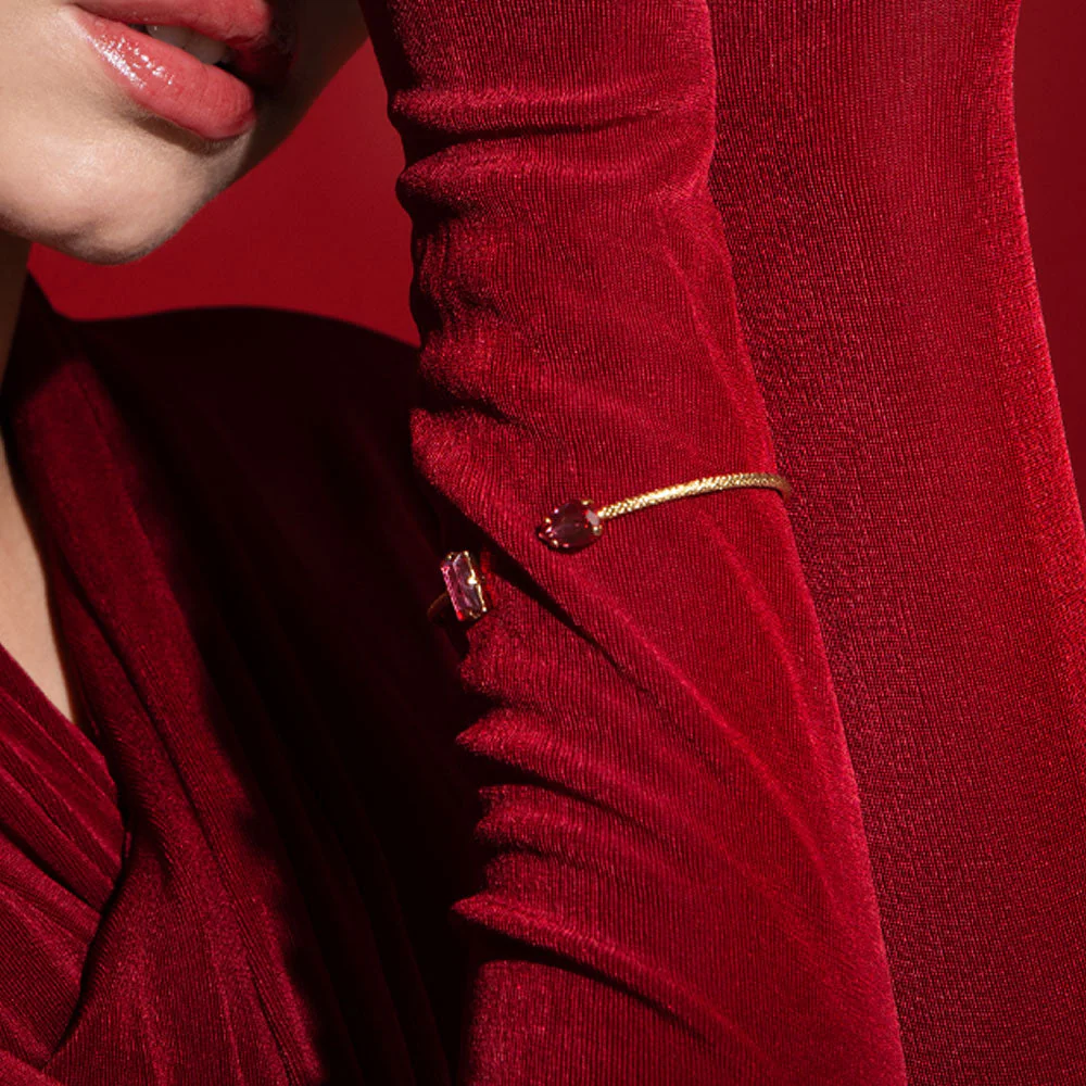 Noelle Bracelet har en öppen design där två kristaller möts – elegant, lekfullt och stilrent.