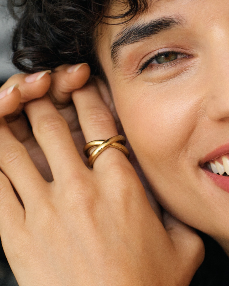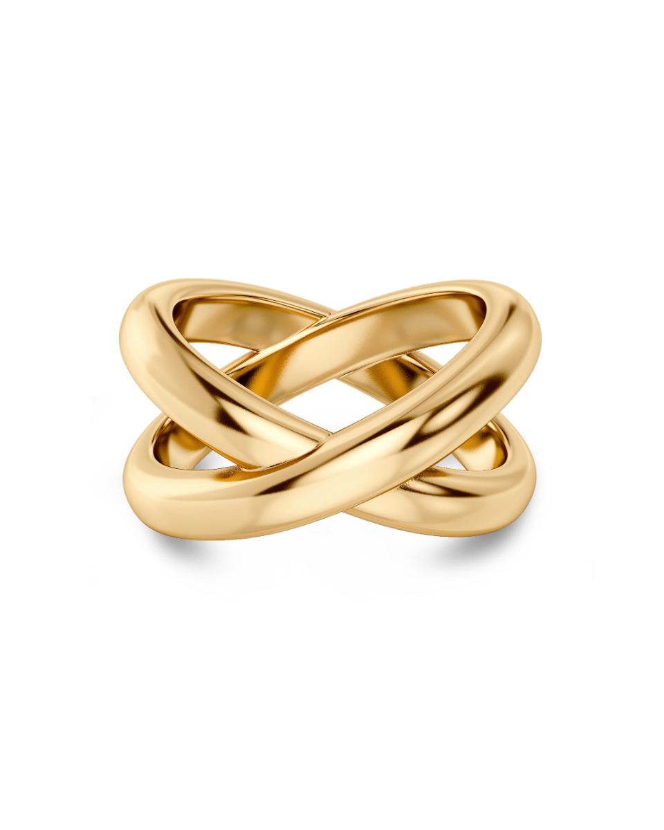 Stilren ring i 14K guldplätering med uttrycksfull X-form. Bredd 4–11 mm. Tillverkad i rostfritt stål, nickelsäker och vattenresistent.