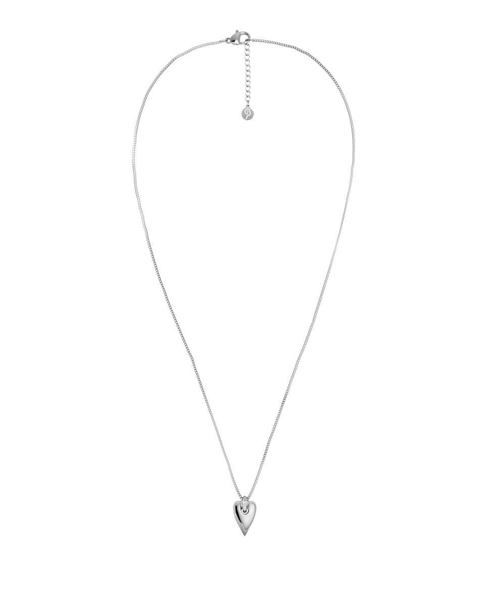 Amore lyfter ett stiliserat hjärta med attityd – där fästet går genom hjärtat för en modern känsla och fin rörelse. Här som ett kortare halsband i blankt rostfritt stål. Finns även som hoops och längre halsband.