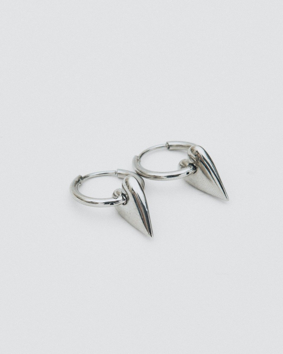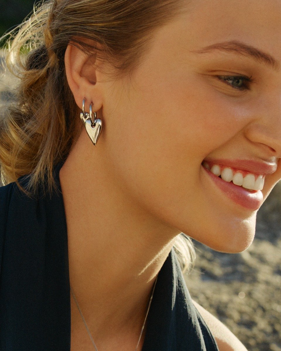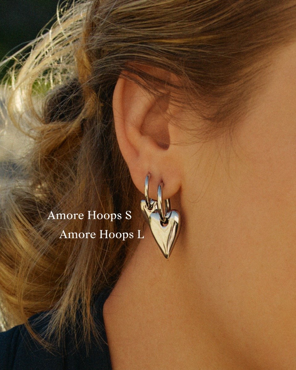 Amore-serien lyfter ett stiliserat hjärta med attityd – där fästet löper genom hjärtat för en modern look och vacker rörelse. Här i mindre hoops i blankt rostfritt stål med avtagbart hjärta – två örhängen i ett. Perfekta att mixa med andra favoriter. Finns även som halsband i två längde