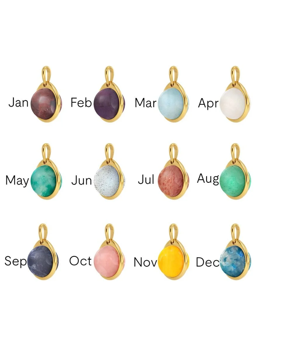 Charmentity Birthstones är en så fin personlig berlock som med sin diskreta infattning lyfter din månadssten. Här ses din månadssten infattad i blank 14K guldplätering. Stenarna är: Januari Granat (mörkröd), Februari Ametist (lila), Mars Akvamarin (ljusblå) April Bergskristall (klar), Maj Smaragdkristall (mörkgrön), Juni Månsten (mjölkvit), Juli Kvarts (röd), Augusti Peridot (grön), September Safir (mörkblå), Oktober Rosenkvarts (rosa), November Jade (gul) och December Blå fosforit (mörkt turkos). Naturstenar skiljer sig alltid något i färgen, så tillåt en viss nyansering utifrån produktfotot.