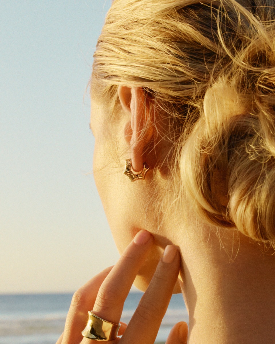 Toppar och dalar i bambuns mönster inspirerar Cane – ett uttrycksfullt smycke med lätta, svällande former. De mindre örhängena matchar perfekt med seriens stora statementarmband. Här i blankt rostfritt stål.