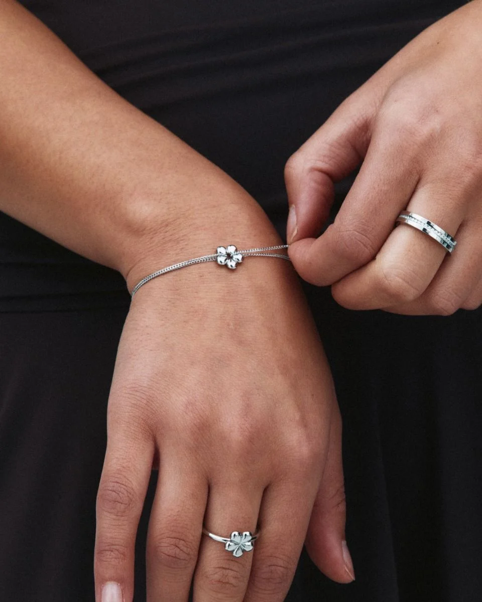 Daisy har en stiliserad tusensköna som sitt signaturmotiv. Serien är lekfull, livfull och enkel att bära, med en rundad, skulptural form som skapar en fin tredimensionell känsla och förmedlar både elegans och charm. Här visas den som ett armband i blankt rostfritt stål, där blomformen är fäst vid en dubbel kedja. Kombinera gärna med örhängen, halsband eller ring från samma serie.