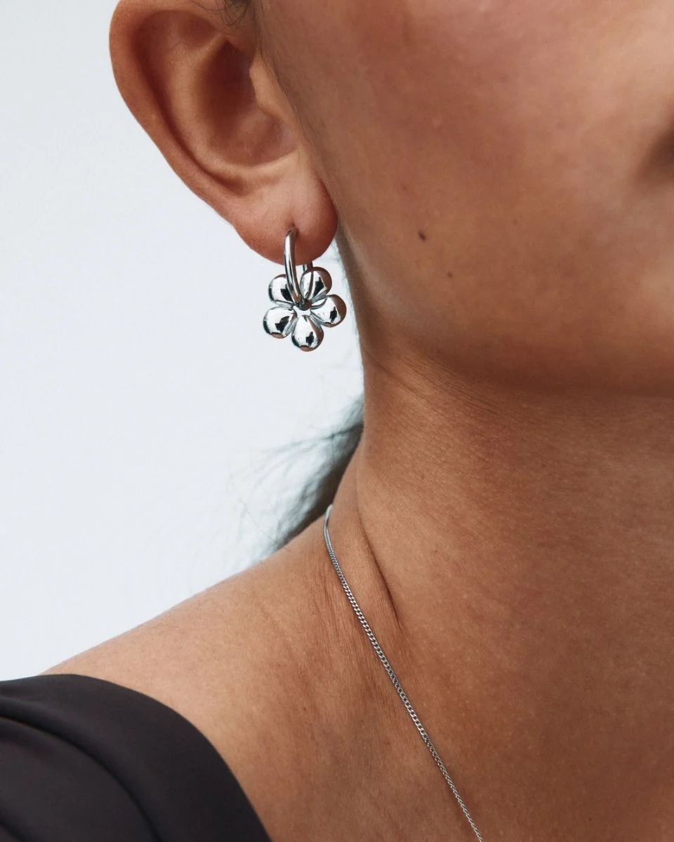 Daisy har en stiliserad tusensköna som sitt signum. Serien är lekfull, livfull och enkel att styla, med en mjukt rundad, skulptural form och en tredimensionell känsla som utstrålar både elegans och charm. Här som hoops i blankt rostfritt stål som sitter fint på örat. Perfekta att mixa med andra örhängen för dig med flera hål, eller att bära tillsammans med armband, halsband eller ring från samma serie.