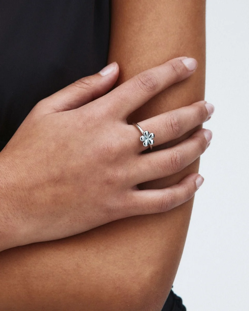 Daisy har den stiliserade tusenskönan som sitt kännetecken. Serien är lekfull, livfull och lätt att styla, med en mjukt rundad, skulptural form och en tredimensionell känsla som utstrålar både elegans och charm. Här som en nätt ring i blankt rostfritt stål där blomformen är fäst direkt på skenan. Fin att bära tillsammans med seriens övriga smycken.