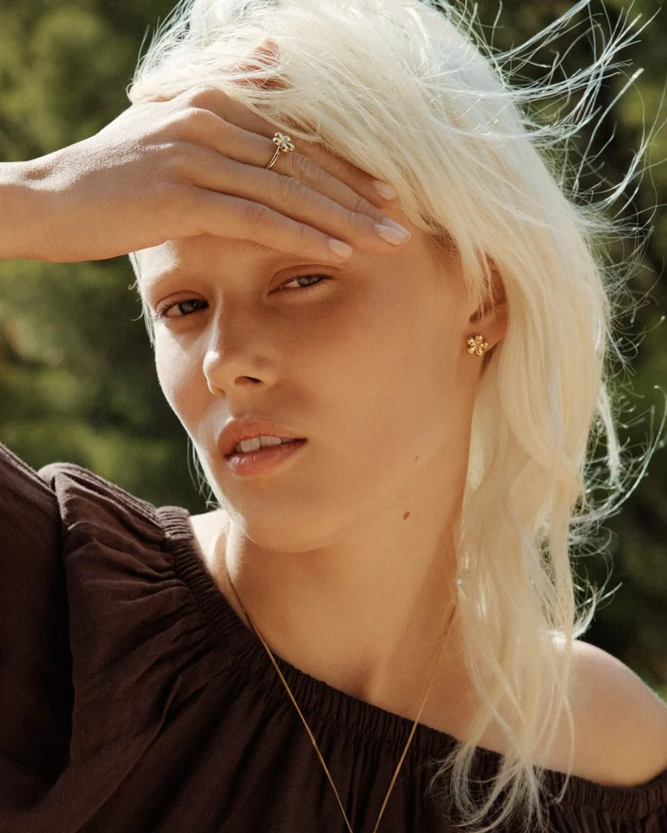 Daisy hämtar sitt uttryck från den stiliserade tusenskönan. Serien är lekfull och lätt att styla, med en mjukt rundad, skulptural design och en tredimensionell känsla som förmedlar både elegans och charm. Här som små studs i 14K guldplätering som sitter fint på örat. Perfekta att mixa med andra örhängen för dig med flera hål, eller att bära tillsammans med matchande armband, halsband eller ring från samma serie.