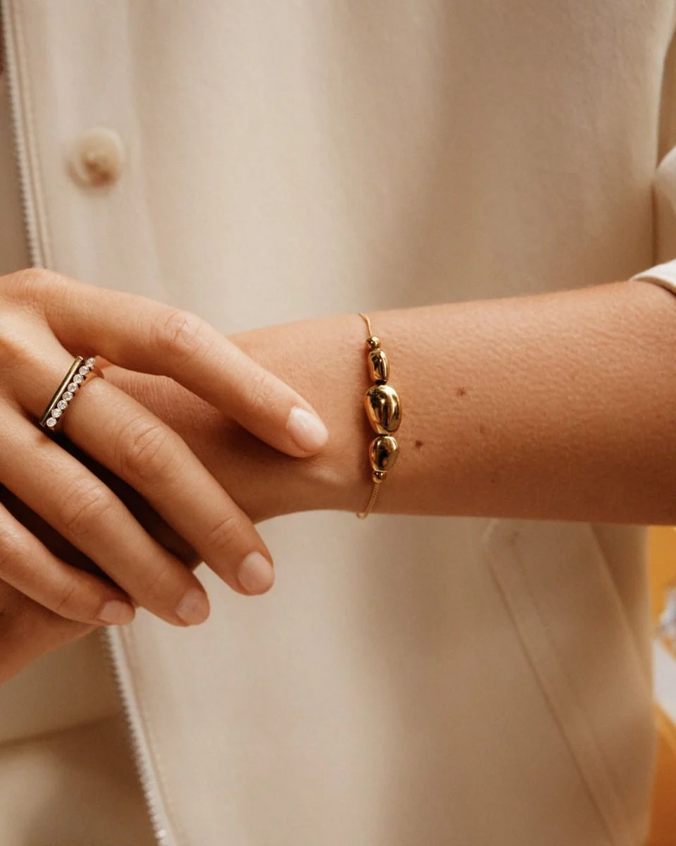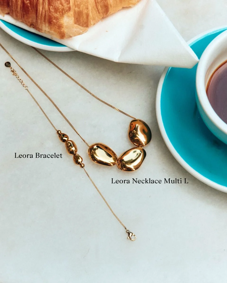 Leora är inspirerad av havsslipade stenar och kombinerar mjuka former med stilren elegans. Här som ett armband i 14K guldplätering med tre små, oregelbundna stenar på en fasetterad pansarkedja. Matcha med seriens örhängen.