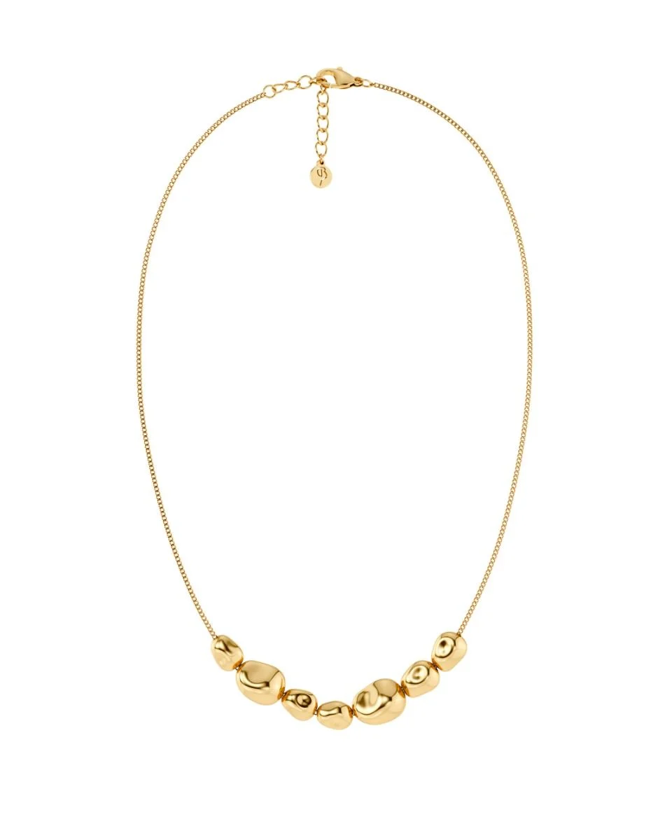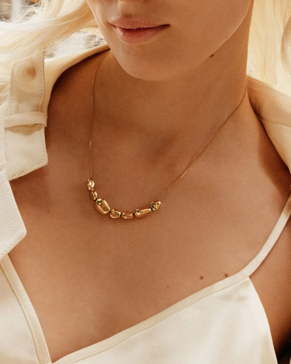 Leora är inspirerad av havsslipade stenar och har en mjuk, stilren design. Här som ett multihalsband i 14K guldplätering med fasetterad pansarkedja och sex oregelbundna stenar. Matcha med seriens örhängen.
