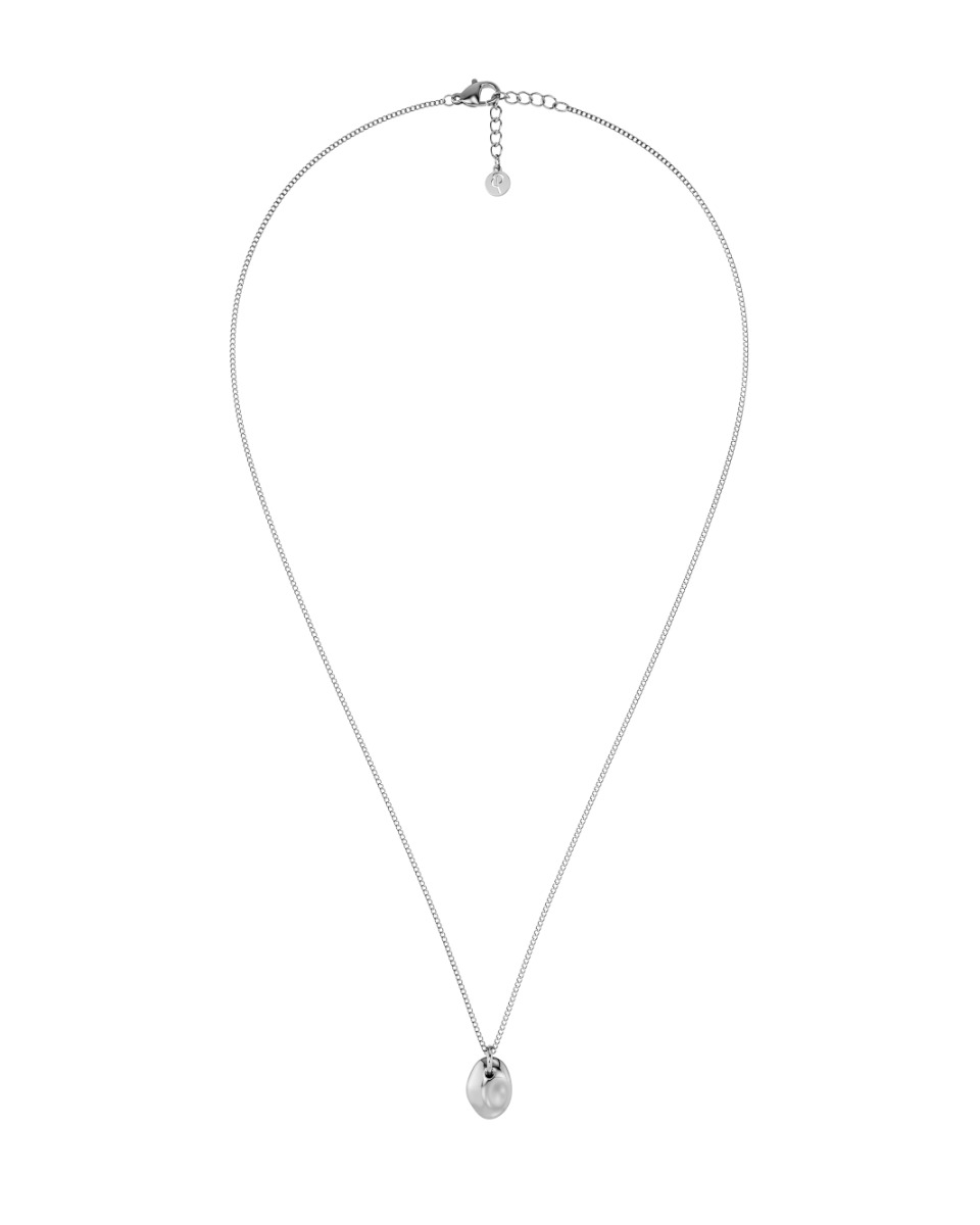 Leora – Halsband i rostfritt stål Leora förenar organiska konturer med en förfinad, minimalistisk elegans. Här i ett halsband med en oregelbundet formad sten som vilar som en charm på en fasettslipad pansarkedja.
