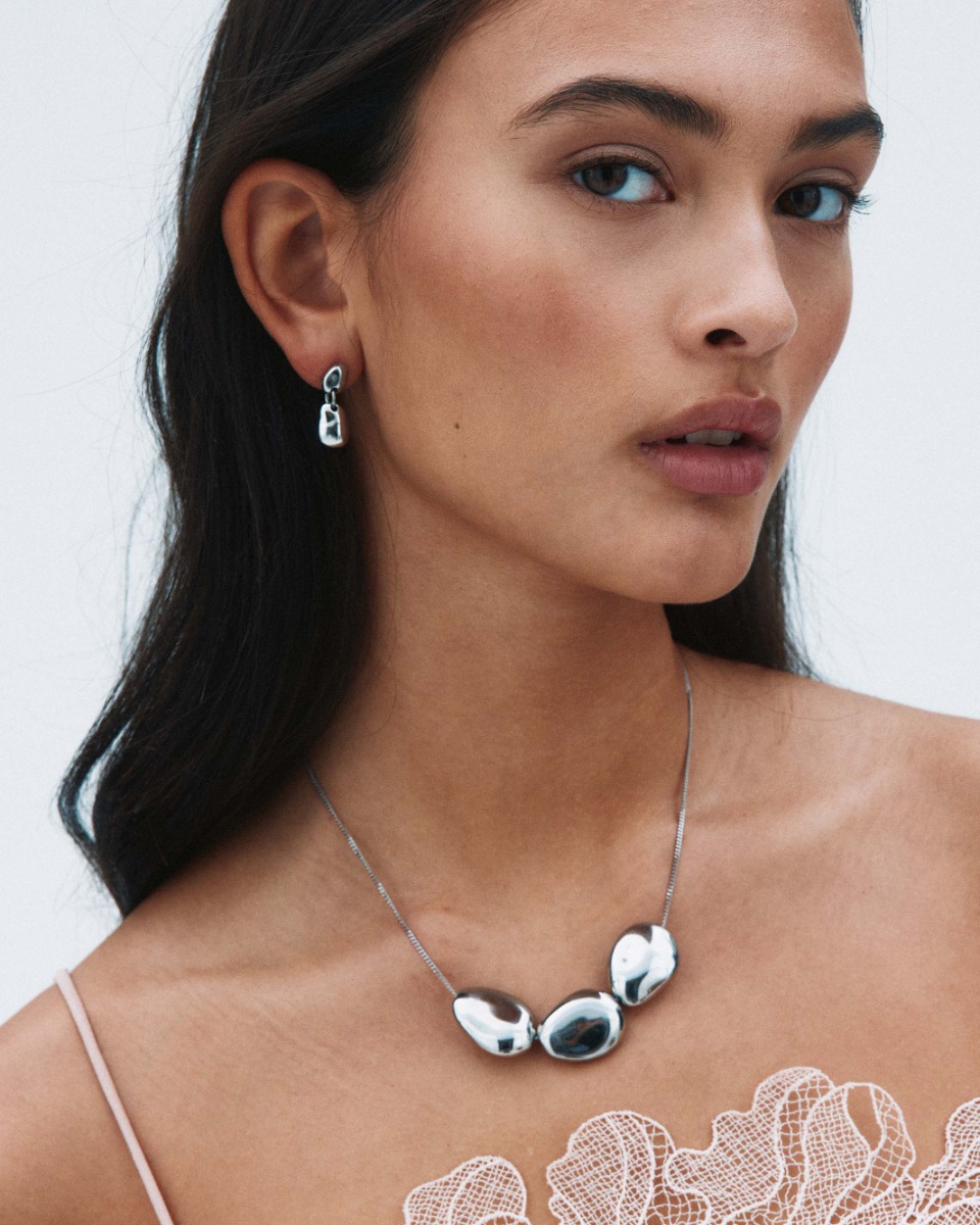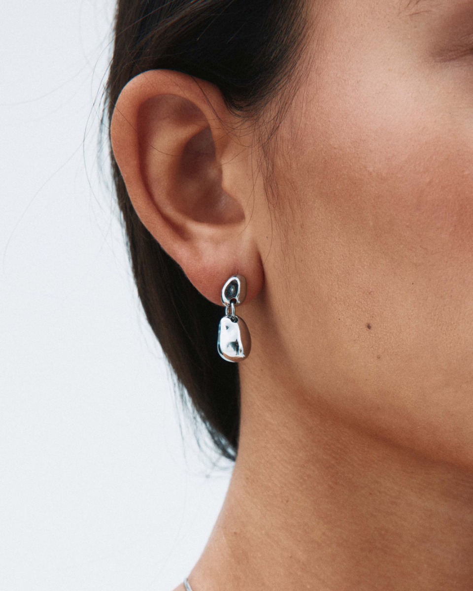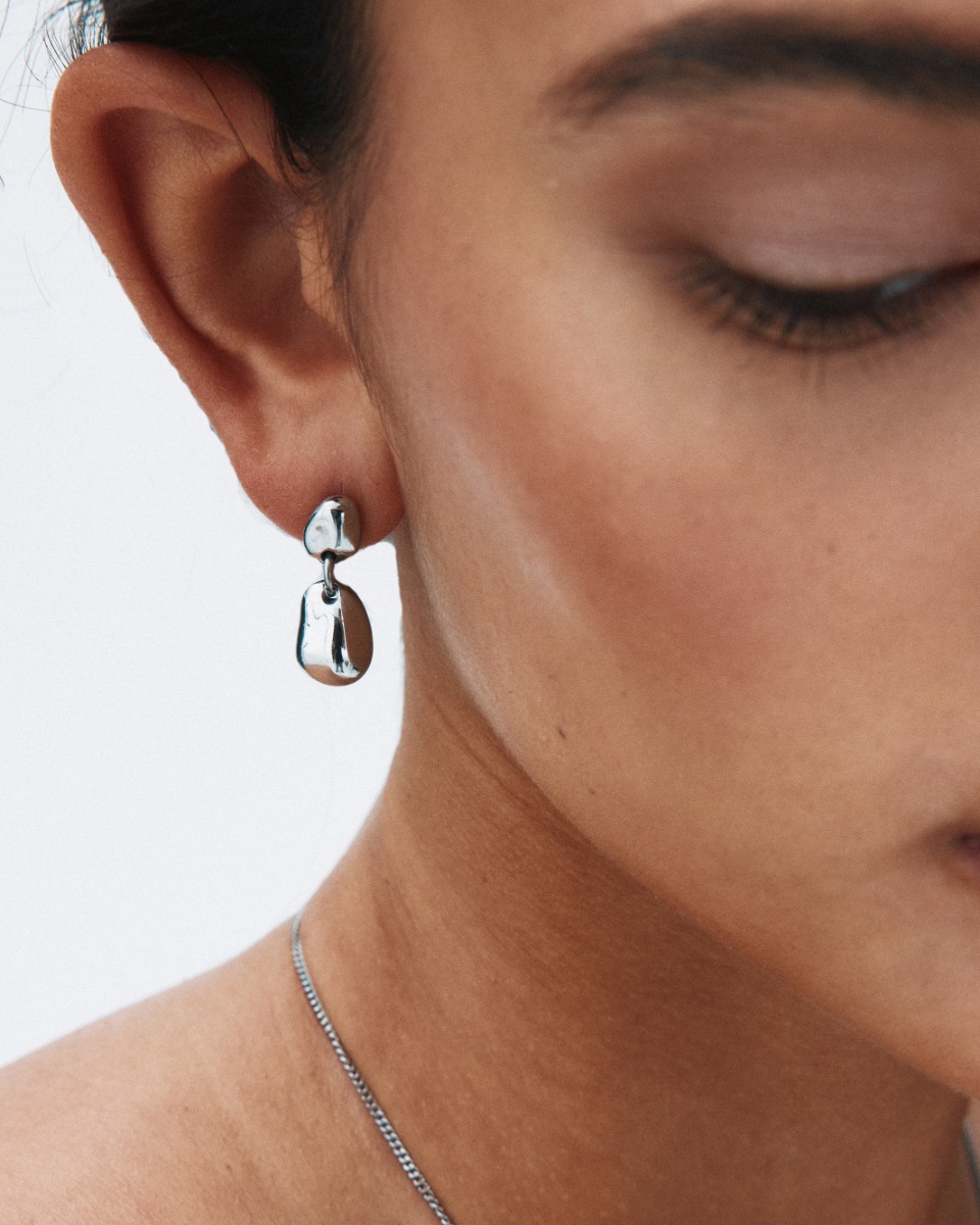 Leora – Örhängen i rostfritt stålLeora förenar mjuka, organiska former med tidlös, minimalistisk elegans. Två oregelbundna stenar faller vackert från varandra och skapar ett levande, sofistikerat uttryck.