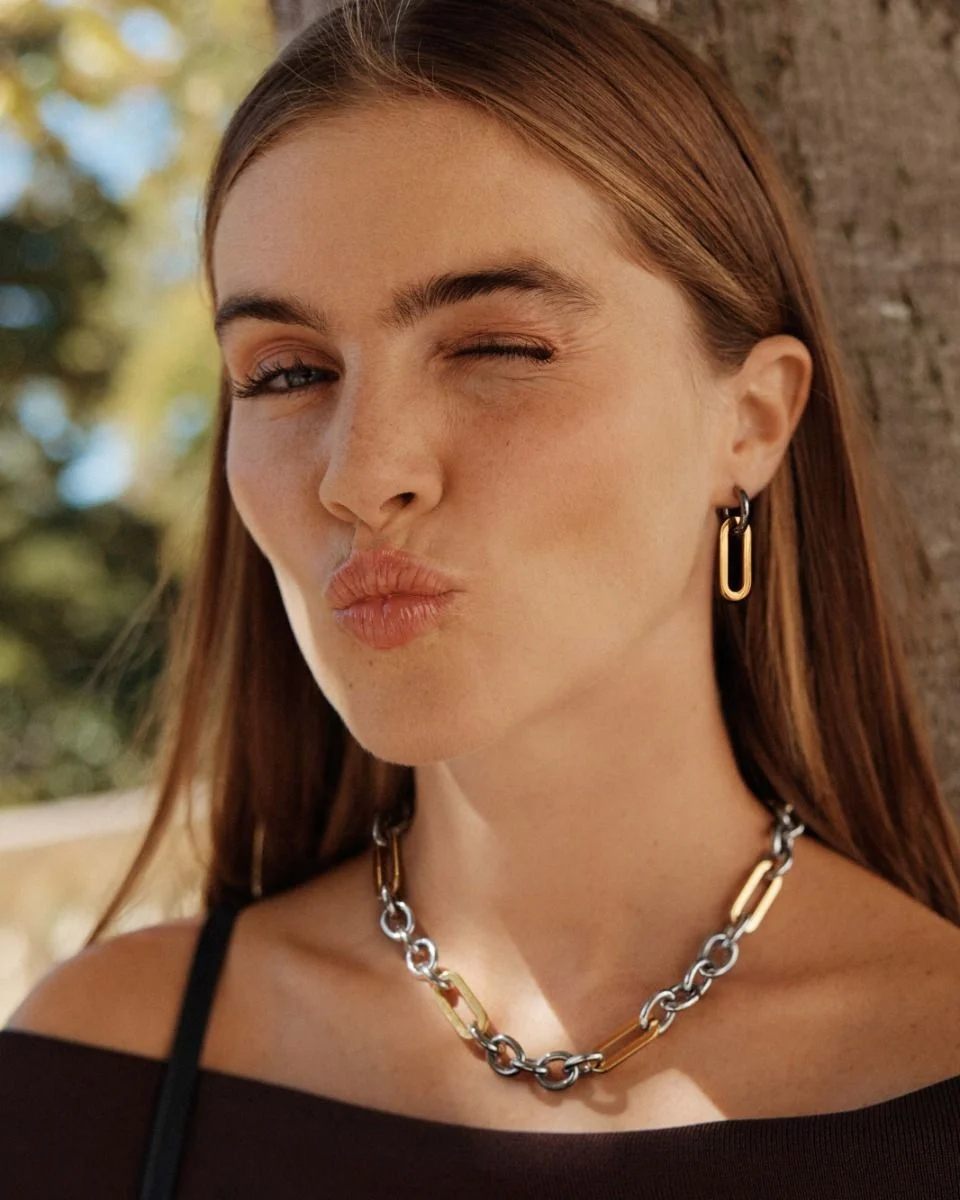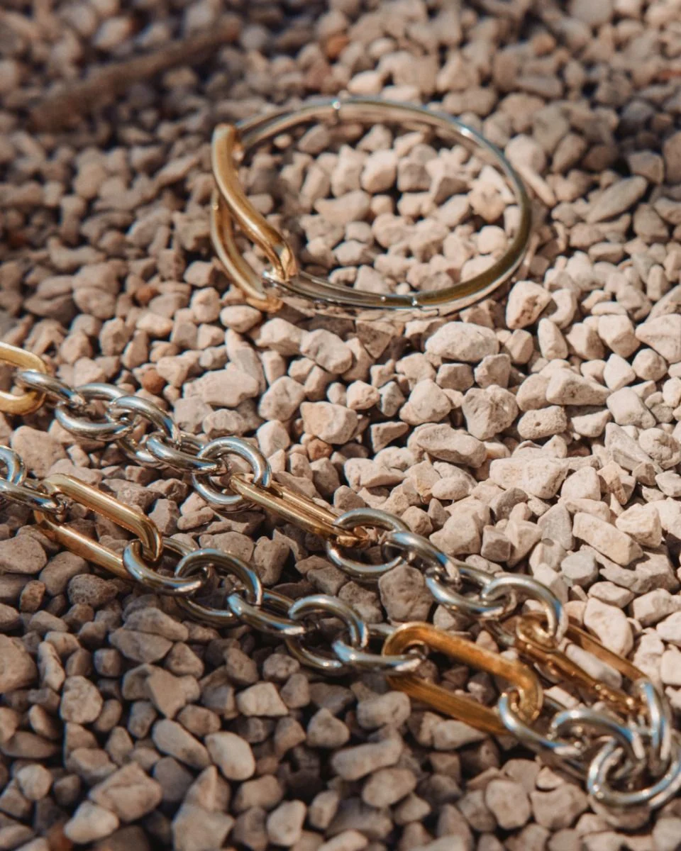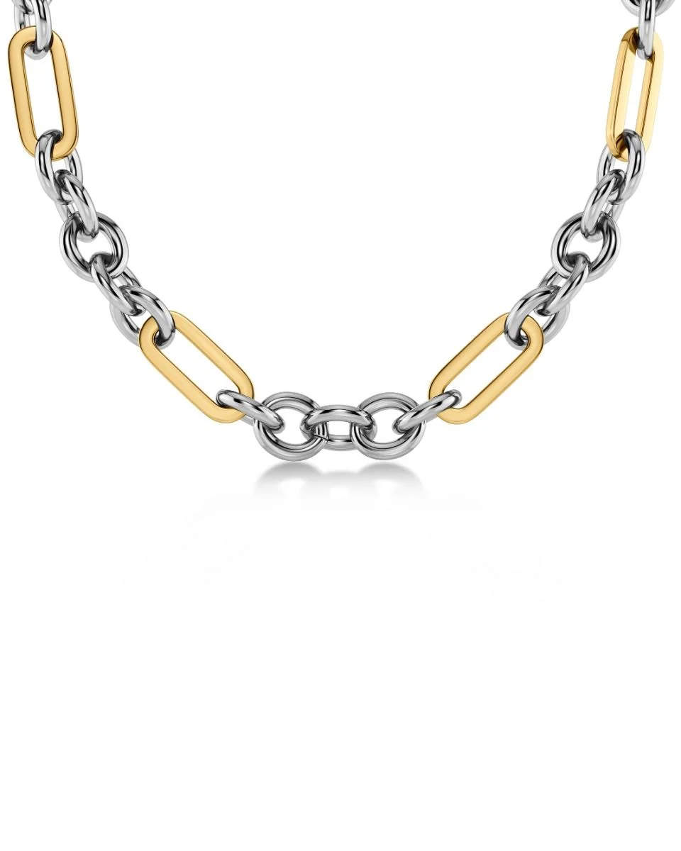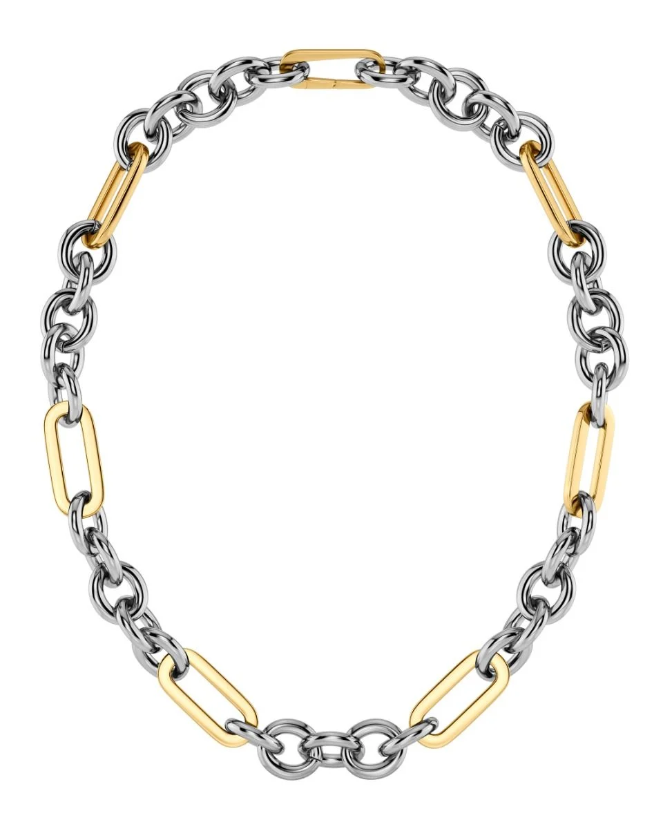 Coola Medley mixar chunkytrenden med rostfritt och guldpläterat stål i en självsäker design. Halsbandet kombinerar stora guldpläterade länkar med mindre i blankt stål och blir extra snyggt tillsammans med seriens övriga smycken.