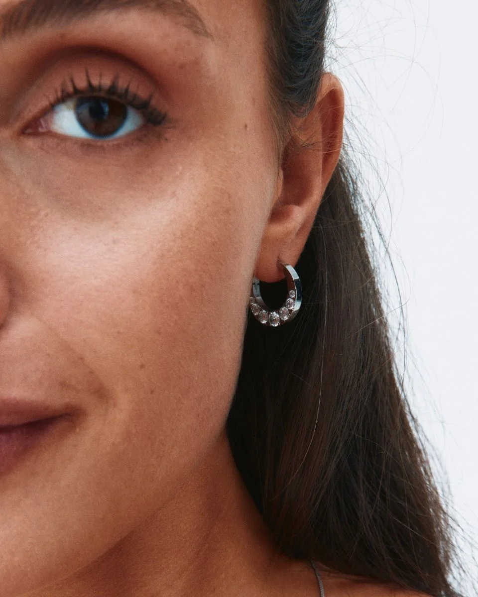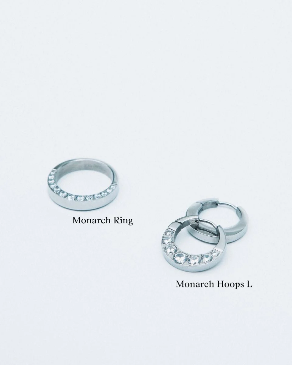 Jubileumsserien Monarch firar 20 år av tidlös elegans från Edblad. Här som större hoops i blankt rostfritt stål med glittrande stenar – en blivande klassiker som lyfter varje outfit.