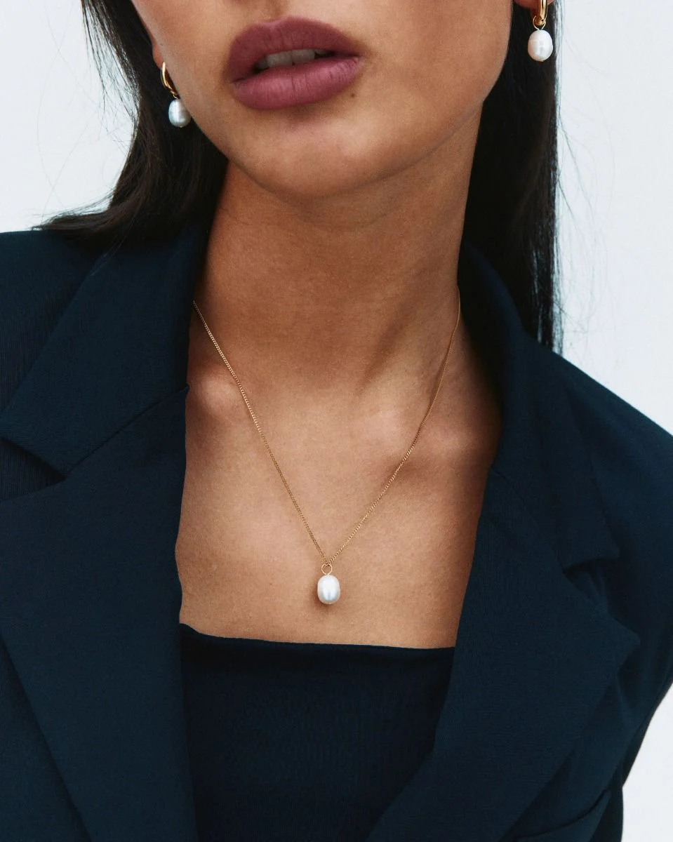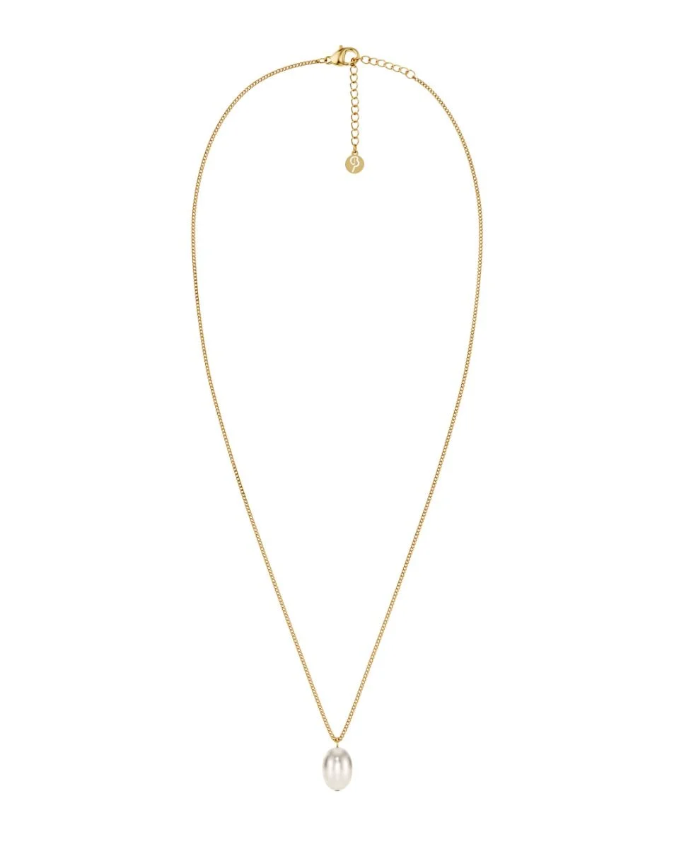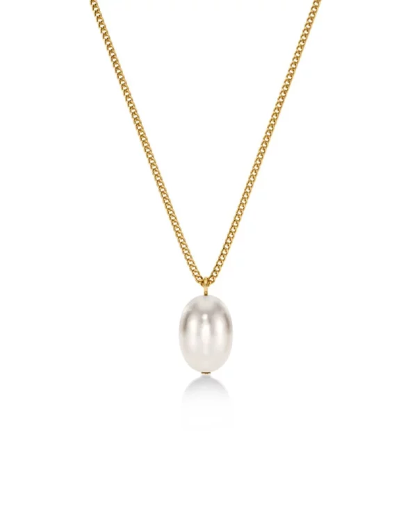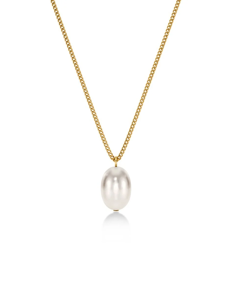 Halsbandet Perla har en stor sötvattenpärla på en fasettslipad ankarkedja i 14k guldplätering.