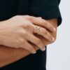 Tvådelad design med ett smalt band med glittrande stenar och ett bredare, slätt band.