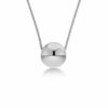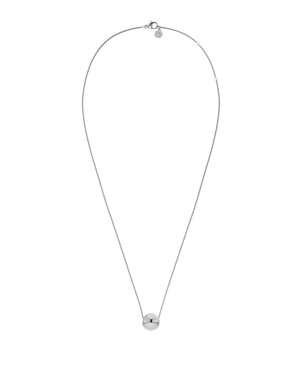 Sphere bygger på klotformer. Här som ett kort halsband där kedjan löper genom en enkel kula i blankt rostfritt stål.