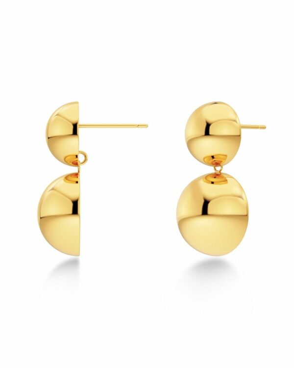 Sphere bygger på klotformer. Här som små örhängen i blankt rostfritt stål med en större halvkula som hänger under en mindre, med dold infästning.