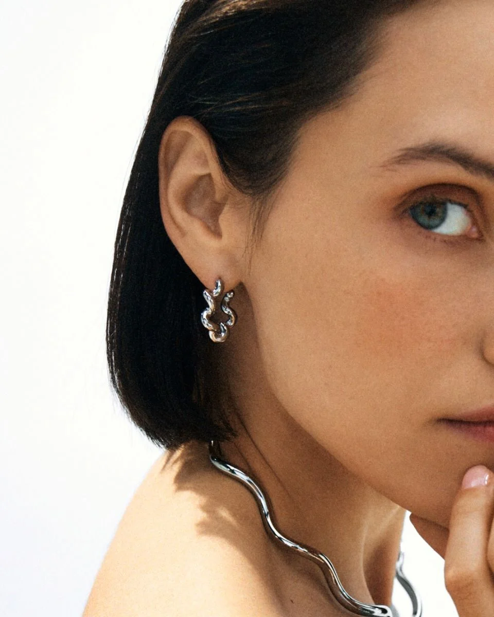 Spiral förenar stålets råa styrka med en mjuk, feminin känsla. Formen påminner om en skulptural vågrörelse i vatten – både djärv och elegant, oavsett tillfälle. Här i en mindre hoop-modell i blankt rostfritt stål, som enkelt kan matchas med andra örhängen för dig med flera hål eller med övriga smycken i serien.
