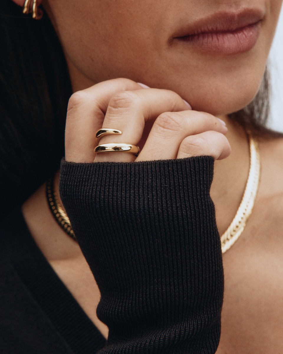Spire – en ring med attitydDenna ring i 14K guldplätering har en cool kloform som går omlott kring fingret och ger ett modernt uttryck. Perfekt att matcha med Spire-hoopsen i samma serie för en enhetlig look med edge.