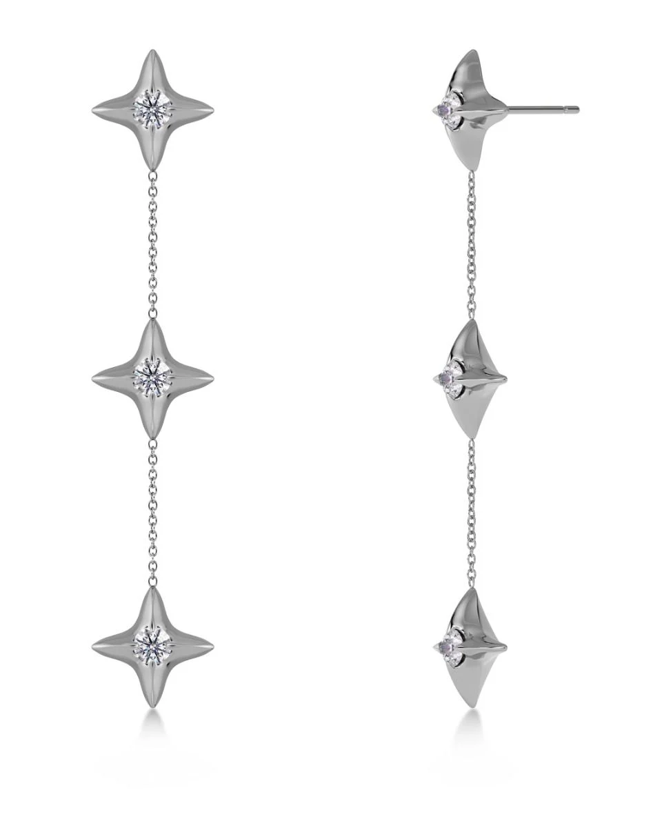 Nätta långa örhängen i blankt rostfritt stål med tre små stjärnor, vardera med en glittrande sten. Fint häng från örat och passar bra ihop med halsband, armband eller ring från serien.