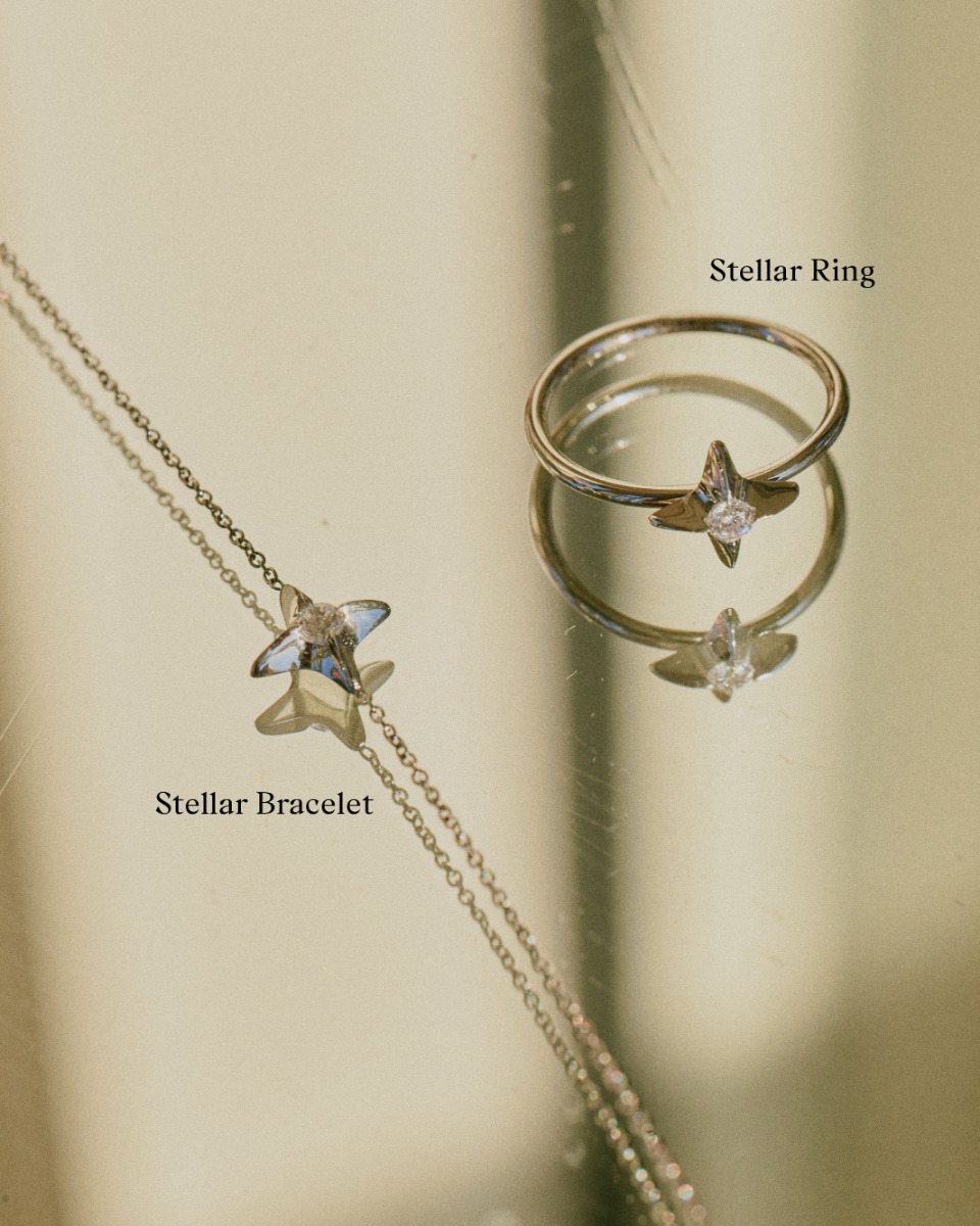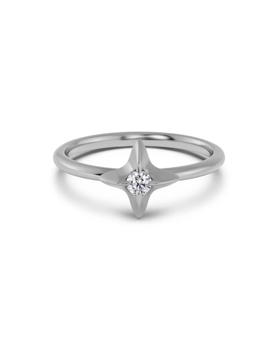 Nätt ring i blankt rostfritt stål med en stjärna och glittrande sten som lyser upp handen. Perfekt att bära ensam eller tillsammans med andra smycken ur Stellar-serien.