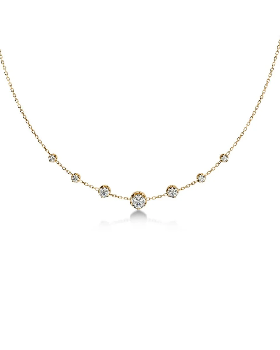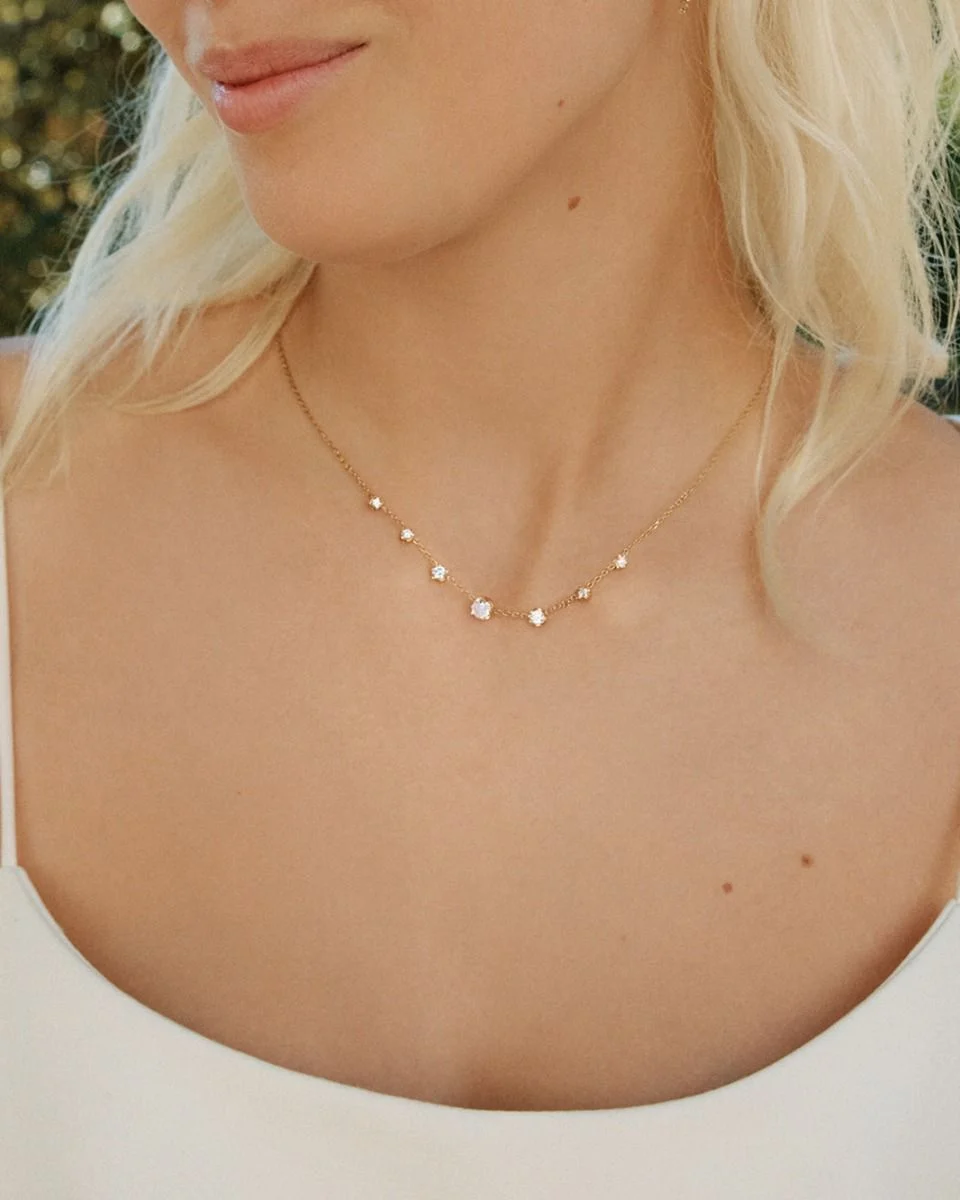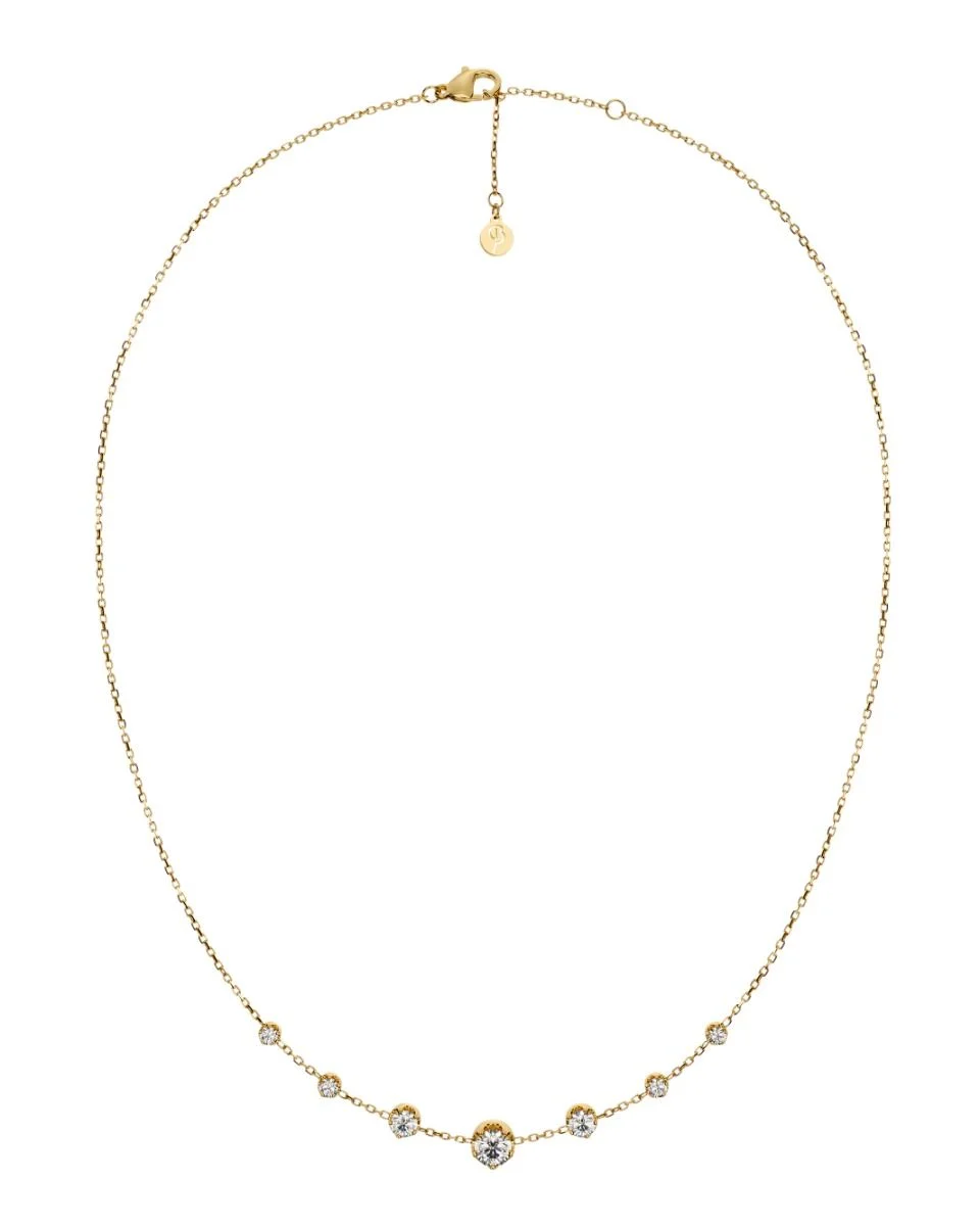 Moderna och sofistikerade Teeny passar den som vill ha ett klassiskt uttryck med glittrande stenar, men med en modern edge. Det fina halsbandet, här i 14K guldplätering, har glittrande stenar i fyra olika storlekar fästa direkt på kedjan. Glittrar ännu mer ihop med seriens örhängen, armband eller ring.