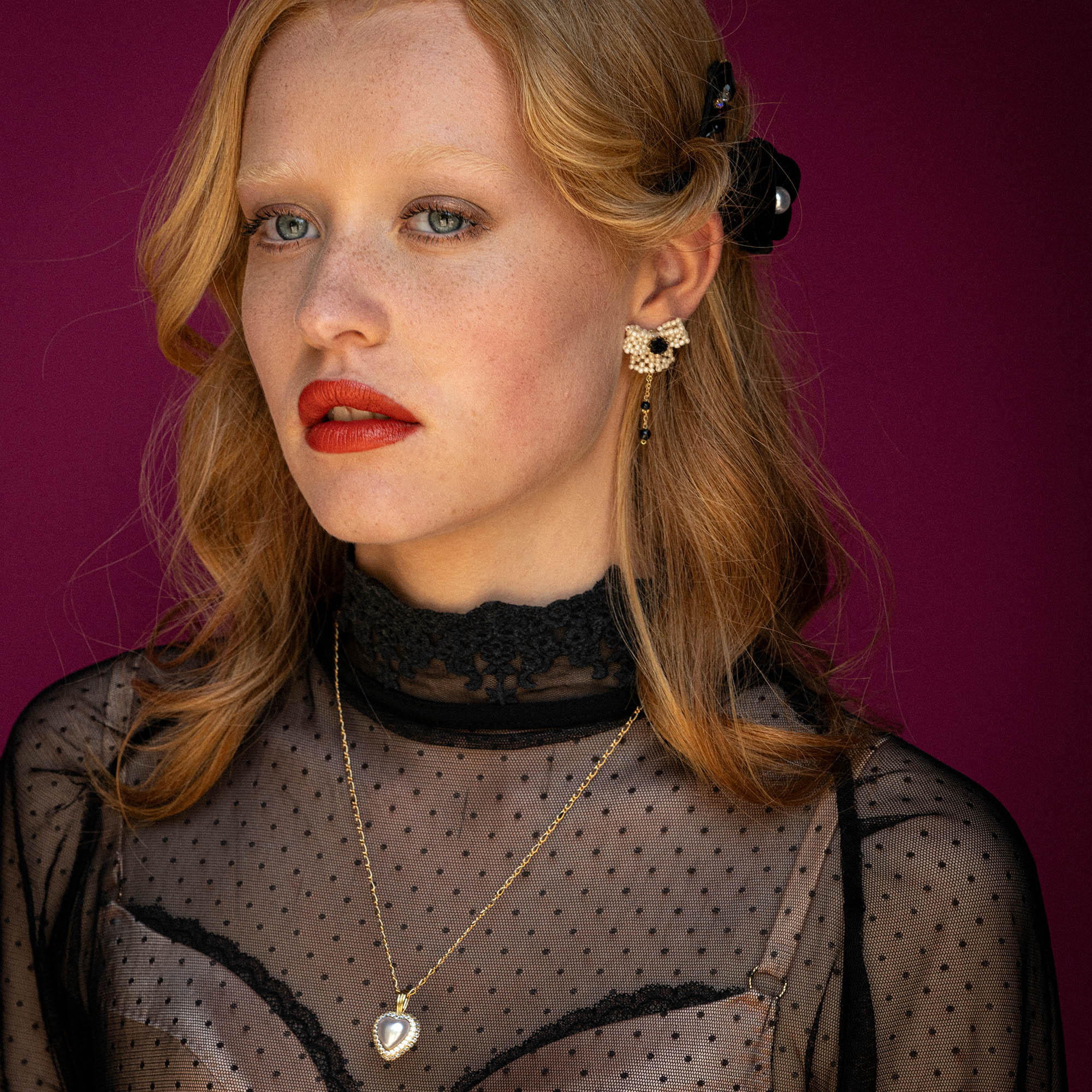 Athena-halsbandet är inspirerat av tidlös romantik och pryds av en hjärtformad pärla omgiven av gnistrande stenar. Den eleganta och detaljrika infattningen framhäver pärlans lyster och skapar ett smycke som är både sofistikerat och förtrollande.