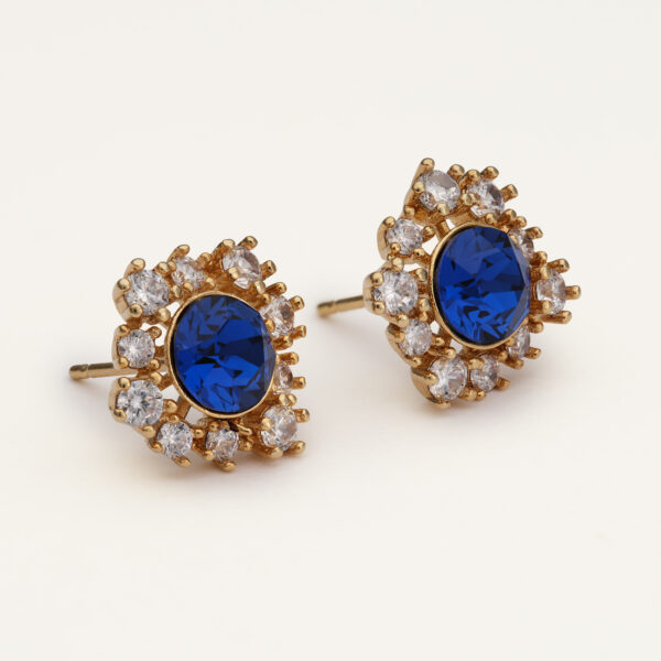 Emily-örhängena strålar av elegans med en förtrollande blå sten omgiven av små klara kristaller. Guldpläterad infattning med push back-låsning.