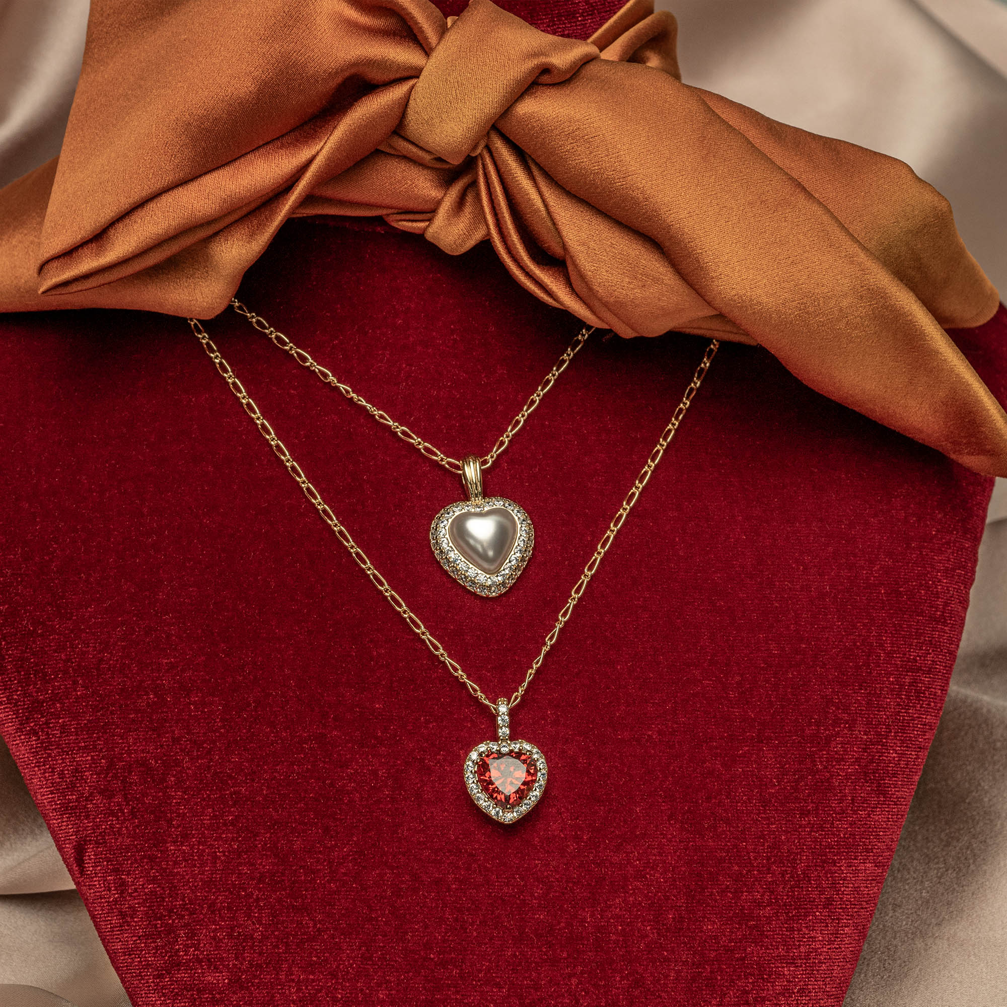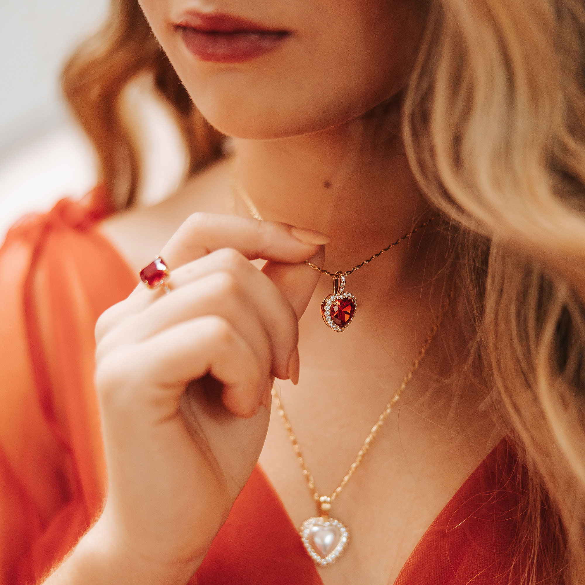 Rose-halsbandet har en vacker granatröd sten i mitten och skimrande klara detaljer som ger en sofistikerad och färgstark glans.