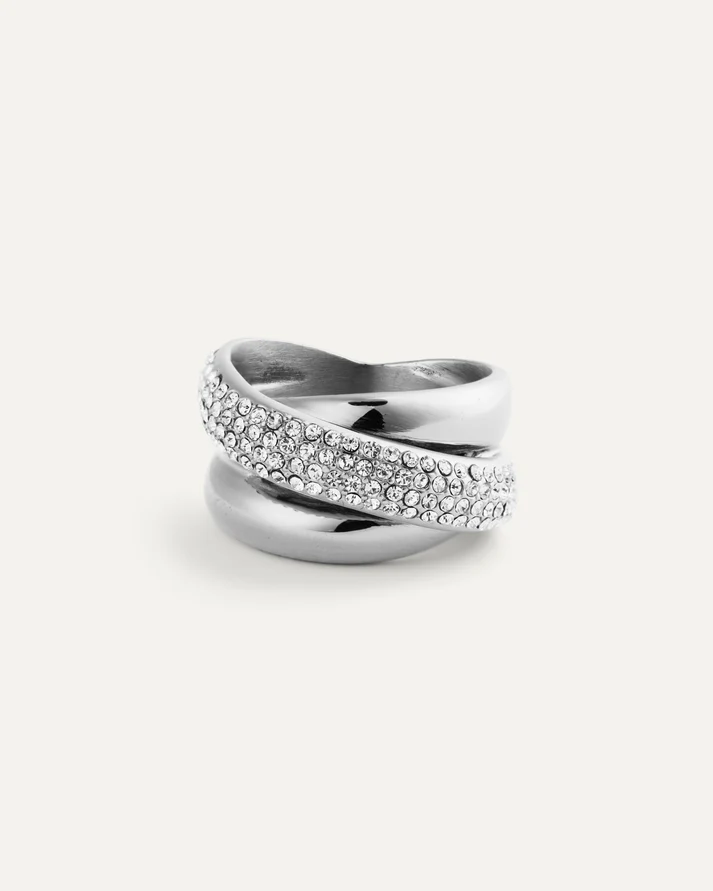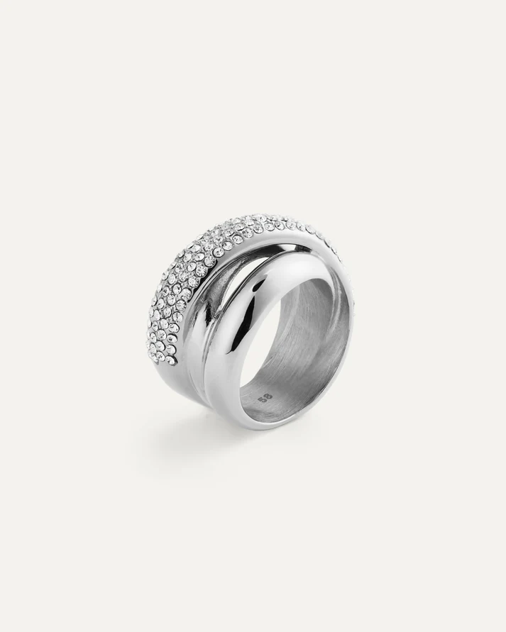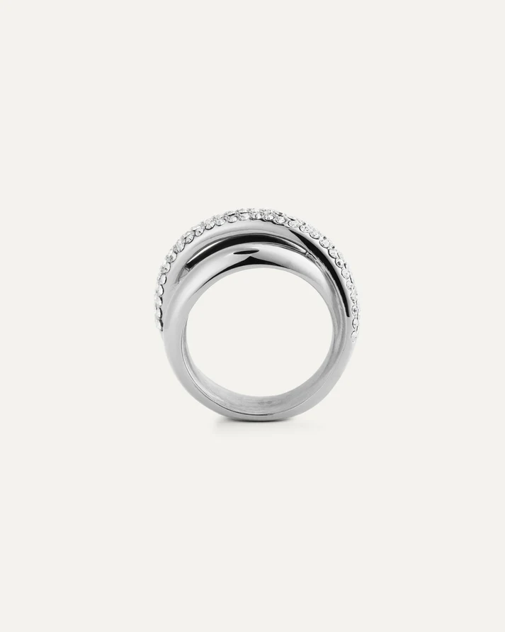 Två världar i balans: mjukt skulpterad metall möter pavé av vita Preciosa-stenar i en tvinnad profil. Den silverfärgade ytan ger ett svalt, tydligt uttryck som fungerar från vardag till kväll. Bär solo eller stapla för mer lyster.