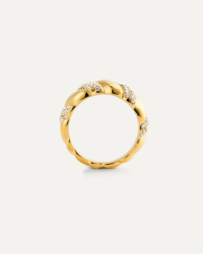 Mjuk, tvinnad profil där slät metall möter pavé av vita Preciosa-stenar – ett litet statement med varm glans. Guldfärgen ger ett tydligt men mjukt uttryck som fungerar från vardag till kväll. Bär den solo för en ren linje eller stapla för mer lyster.