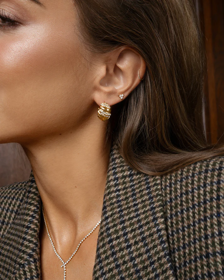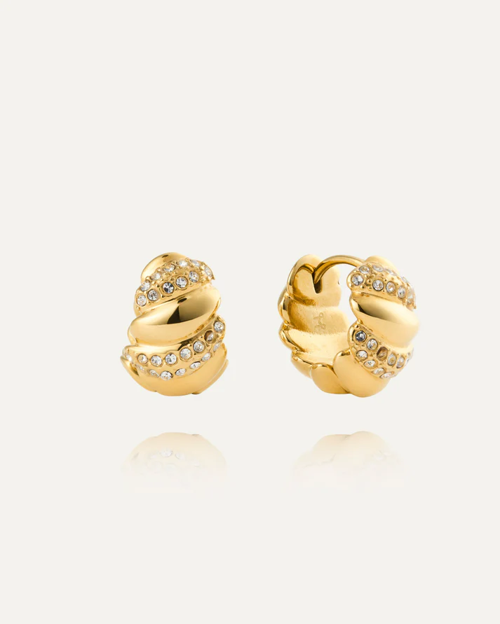Varm glans och tvinnad form med vita Preciosa-stenar som fångar ljuset fint. Ett par som ger närvaro utan att ta över – lika bra solo som i lager.