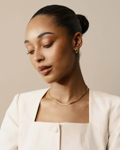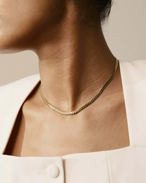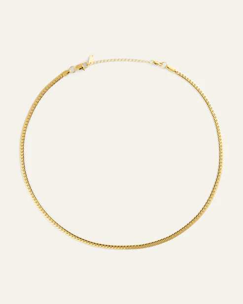 Ett elegant halsband med platt, följsam ormkeda som fångar ljuset i varje rörelse. En stilren detalj som lyfter din look med diskret lyster.