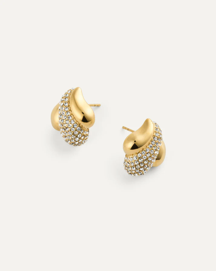 Skulpterad form med mjuka svep och tätt satta vita Preciosa-stenar som fångar ljuset. Guldfärgen ger ett tydligt uttryck som fungerar från vardag till kväll.