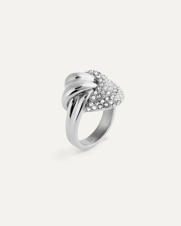 Tätt satta vita Preciosa-stenar i en mjukt tvinnad profil ger klar lyster och ett tydligt uttryck. Silverfärgen håller stilen sval och är enkel att kombinera – från vardag till kväll. Bär solo eller i stack för mer glans.