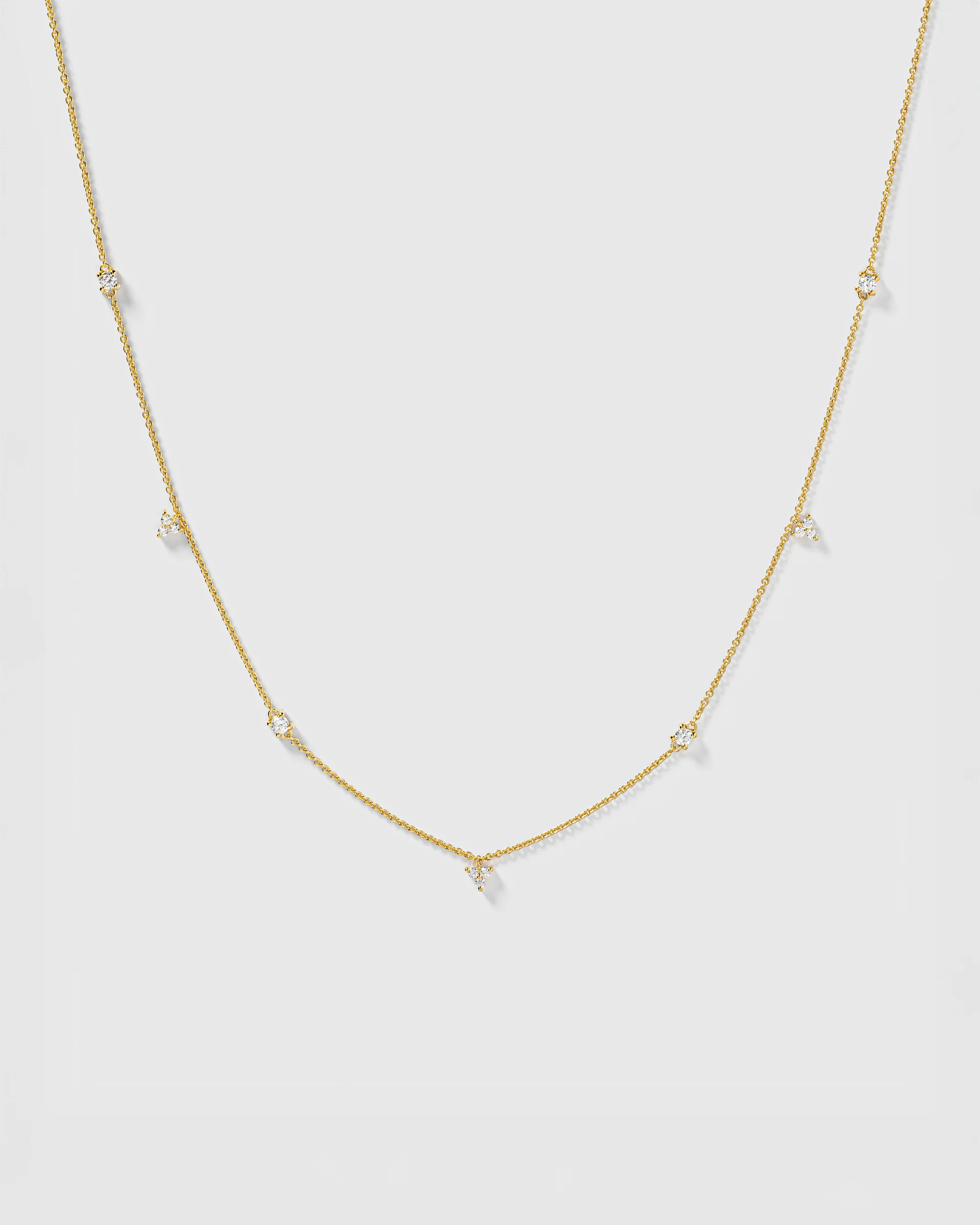 Ett enkelt men elegant halsband som ger varje look en gnistrande detalj. Halsbandet är dekorerat med nätta kubiska zirkoner i olika former. Handgjort i äkta sterlingsilver, 100% återvunnet, pläterat med 18K guld.