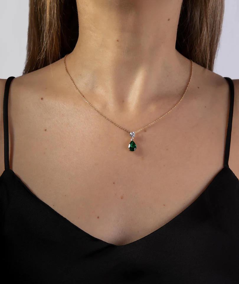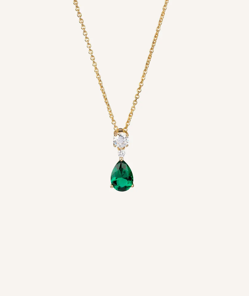 Teardrop halsband från signatur kollektionen. Halsbandet är i silver som är 18k guldpläterat med infattade zirkoniastenar och smaragddroppar. Elegans och glamour förvandlad till en juvel.