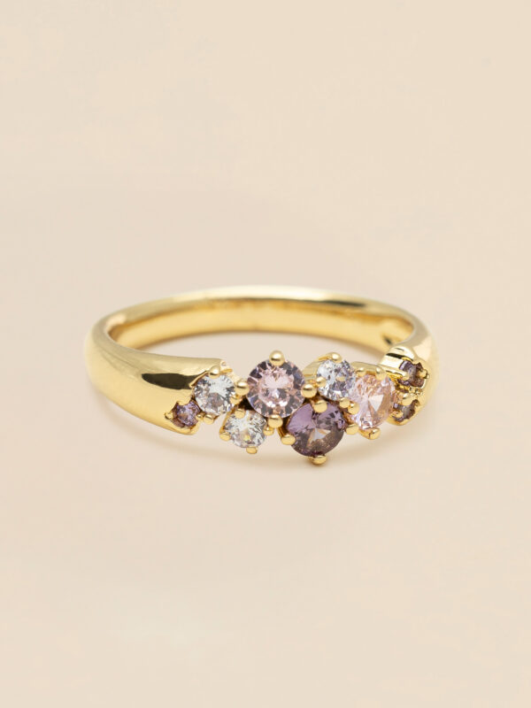Meadow-ringen i 18k guldpläterad mässing har stenar i rosa, ametist och klara nyanser, vackert infattade bland små gulddetaljer. En feminin ring som passar fint ensam eller ihop med Petite Meadow-ringen.