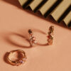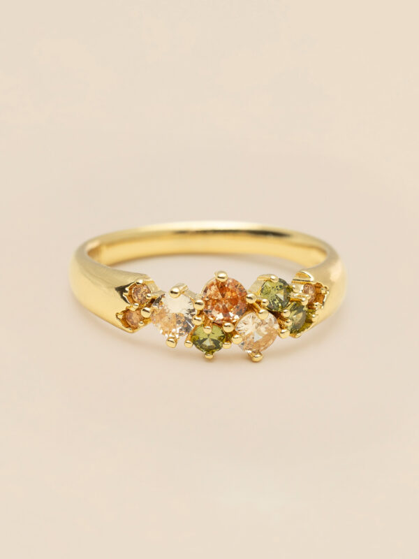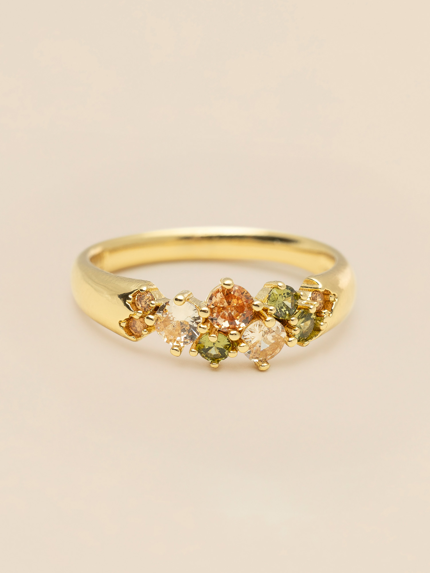 Meadow-ringen har cubic zirconia-stenar i jordnära toner, omgivna av små gulddetaljer. Den är tillverkad i 18k guldpläterad mässing och har kristaller i grönt och topasnyanser som ger ett vackert skimmer. Passar fint ihop med den smalare Petite Meadow-ringen.