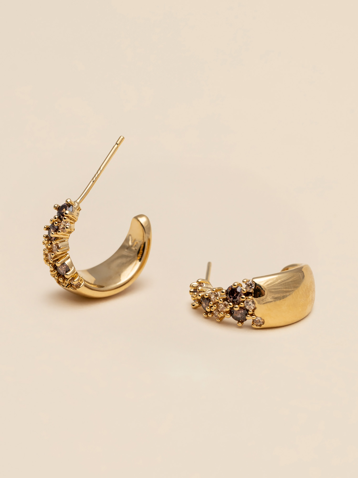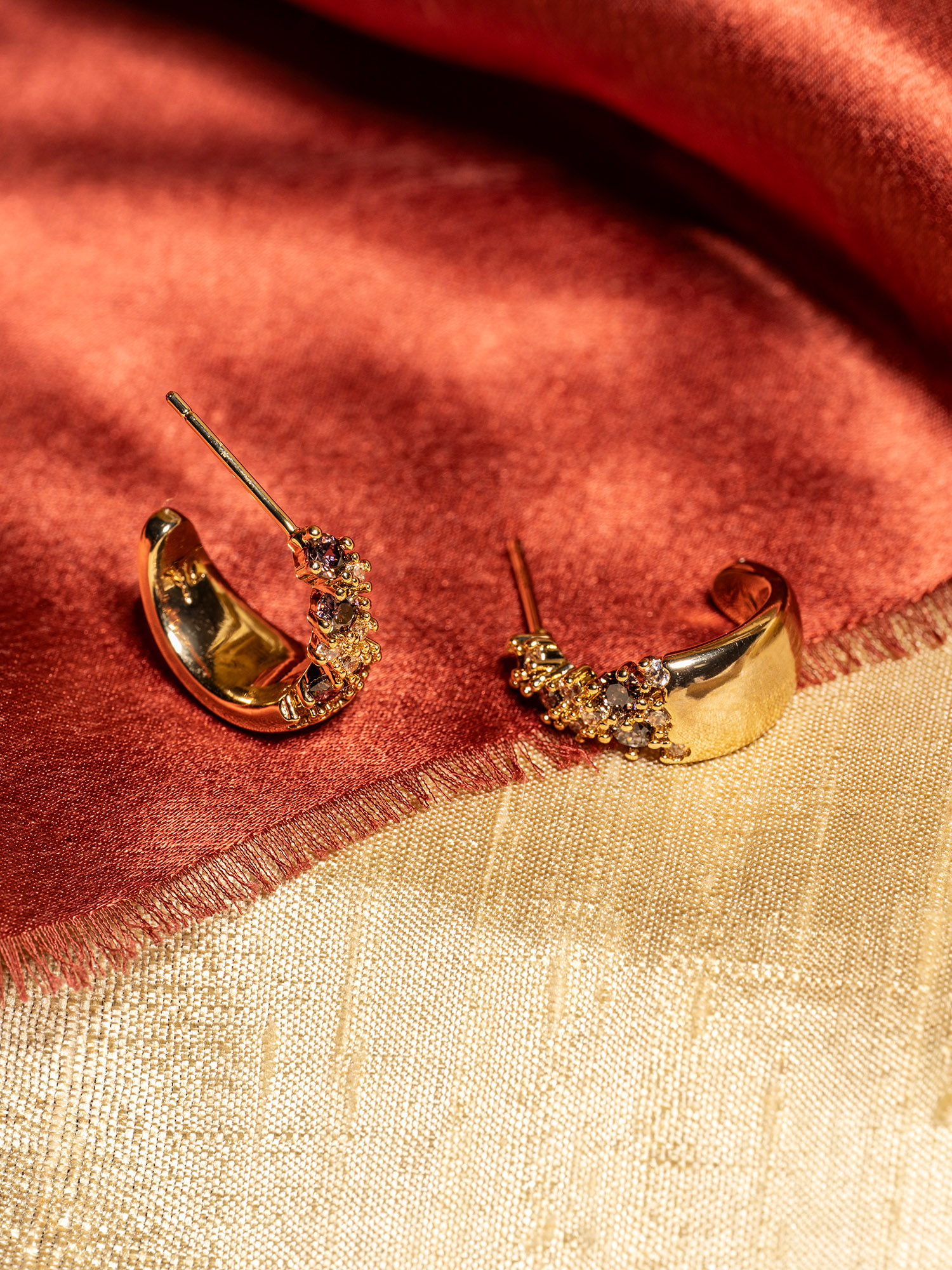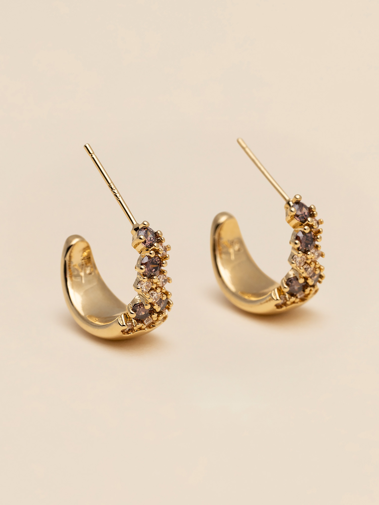 Petite Meadow Hoops har cubic zirconia-stenar i varma toner av brunt och champagne, fint omgivna av små gulddetaljer.