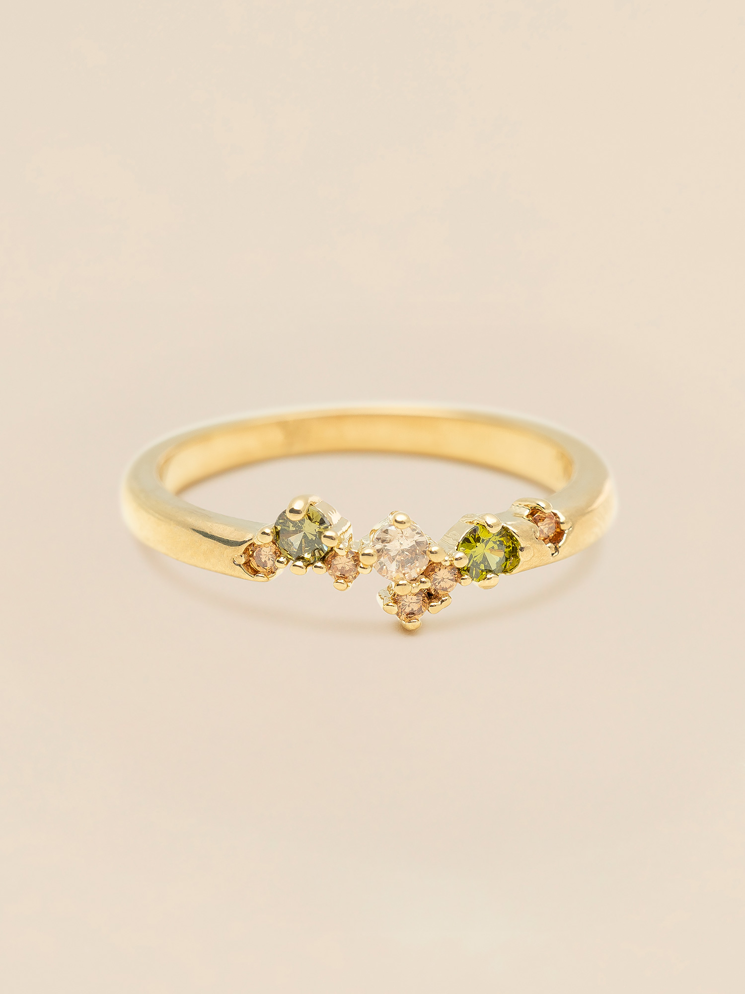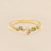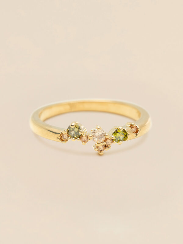 Petite Meadow-ringen i 18k guldpläterad mässing har gröna och topasfärgade stenar bland små gulddetaljer. Fin att bära ensam eller med Meadow-ringen.