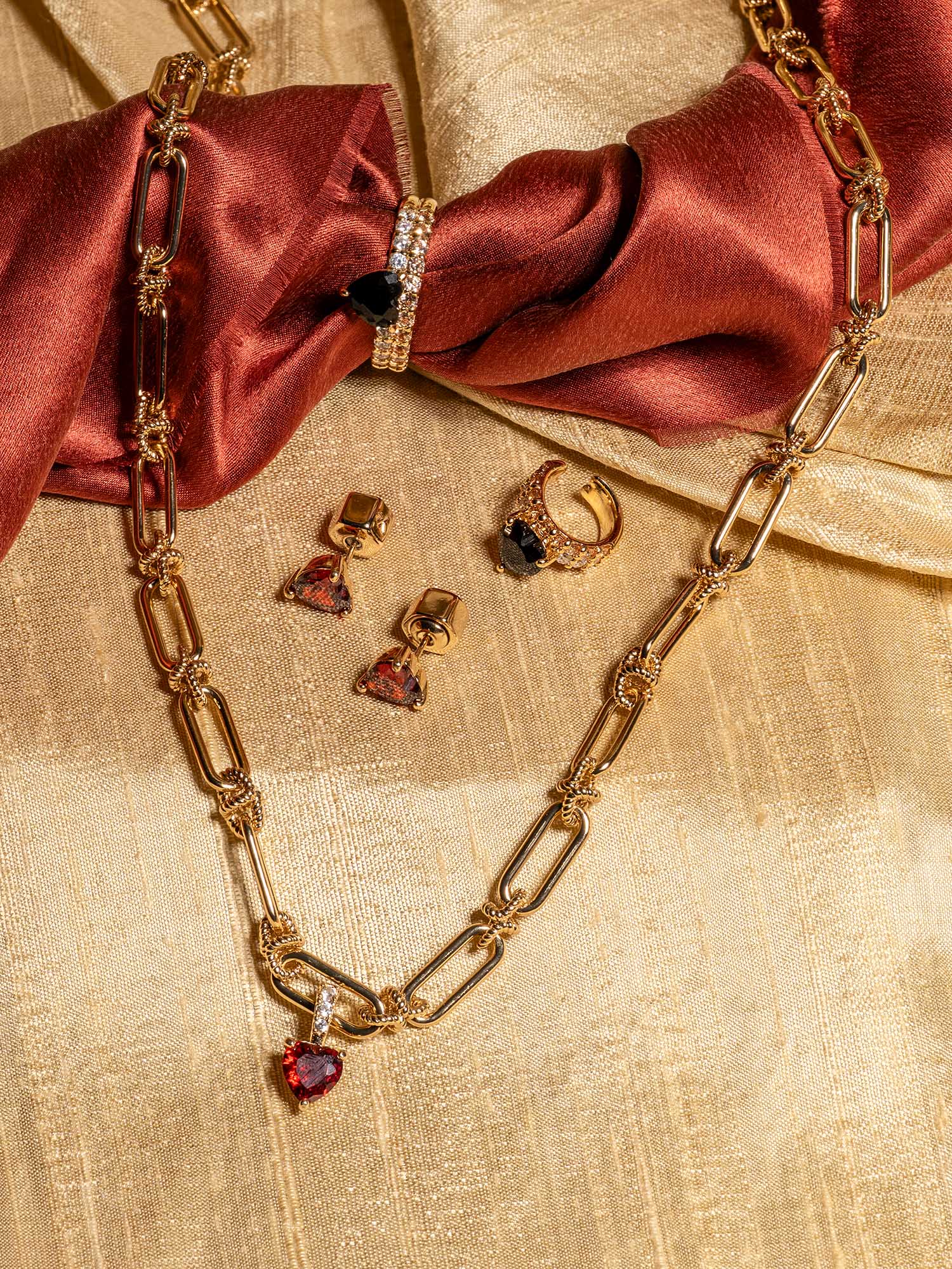 En tidlös kärlekssymbol i modern tappning. Venus-örhängena kombinerar romantik och edge med sin hjärtform och röda sten. Stilrent men iögonfallande – ett smycke som står ut.